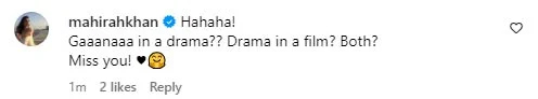 Mahira responded delightfully on Fahad’s post saying, “Gaaanaaa [song] in a drama?? Drama in a film? Both? Miss you!”.