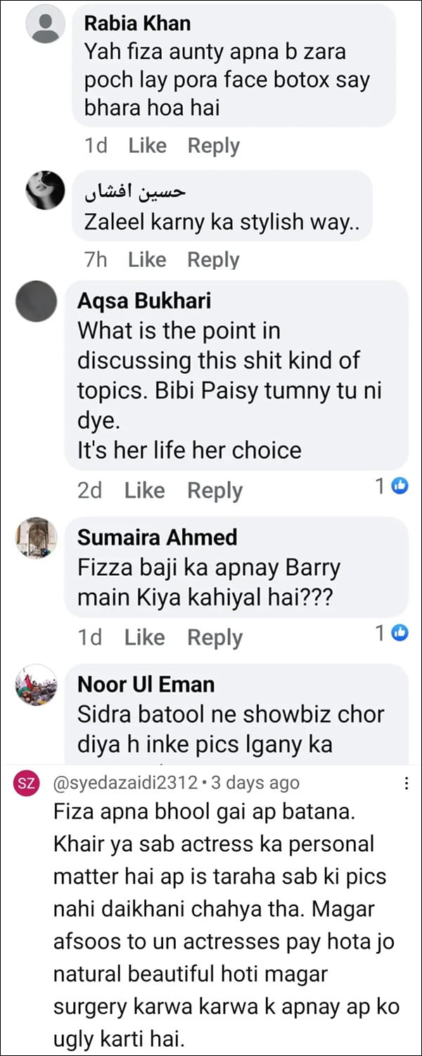 Fiza mentioned, Mashi Khan, Sarwat Gillani, Sidra Batool, Mehwish Hayat, Mahnoor Baloch, Ayesha Khan and others.