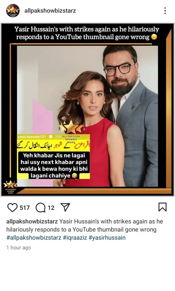 The fake thumbnail featured the picture of Yasir and his wife actress Iqra Aziz, with note that the director passed away.