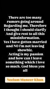 Neelam Muneer wrote that yes I am married and no I am not leaving showbiz, acting is my passion and how can I leave something that I love very much.
