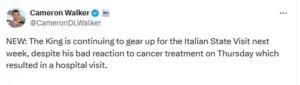 Additionally, royal correspondent Cameron Walker noted that despite experiencing a setback due to a reaction to his cancer treatment last Thursday, which required medical attention, the King is preparing for his official visit to Italy next week.