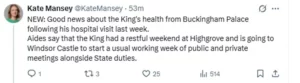 Royal expert Kate Mansey shared the news on X (formerly Twitter), posting a statement from the palace regarding the monarch’s condition. She wrote, “NEW: Good news about the King’s health from Buckingham Palace following his hospital visit last week. Aides say that the King had a restful weekend at Highgrove and is now heading to Windsor Castle to resume his usual working week, including public and private meetings alongside State duties.”
