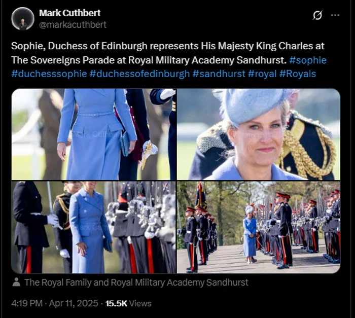 Royal photographer Mark Cuthbert shared photos from the event on X (formerly Twitter), with the caption, “Sophie, Duchess of Edinburgh represents His Majesty King Charles at The Sovereign’s Parade at Royal Military Academy Sandhurst.”