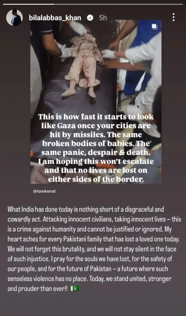 Rising stars like Bilal Abbas Khan, Urwa Hocane, and Muneeb Butt also voiced their support for Pakistan, calling out Indian aggression and rejecting the idea of appeasing Indian critics. Muneeb made it clear: “Pakistanis never keep anyone’s debt,” referring to Pakistan Air Force’s powerful response.