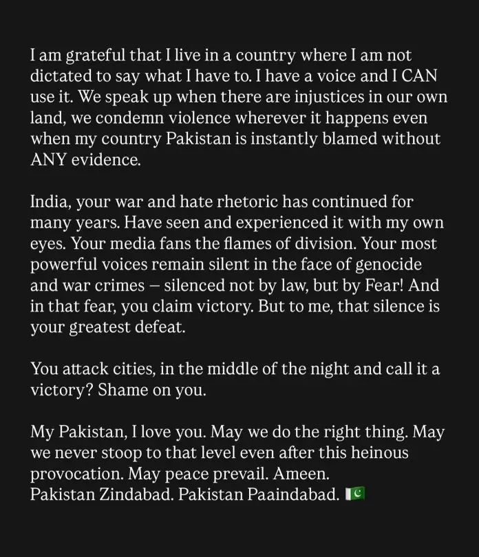 Tensions between Pakistan and India have intensified once again, but this time, several Pakistani celebrities have taken a bold and fearless stance in support of their homeland. Known for often promoting peace, these stars chose not to stay silent when India attempted to blame Pakistan for the recent tragic deaths in Pahalgam. Instead, they stood up for their country with clarity and pride, refusing to allow false narratives to prevail.