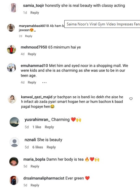 Recently, a video of Saima Noor exercising at the gym has gone viral, sparking admiration and fitness inspiration among her fans. Social media users have been quick to share compliments, with one commenting, “She is evergreen,” another stating, “She has been the same and pretty since the 90s,” and one fan adding, “She is the real beauty with class acting.”