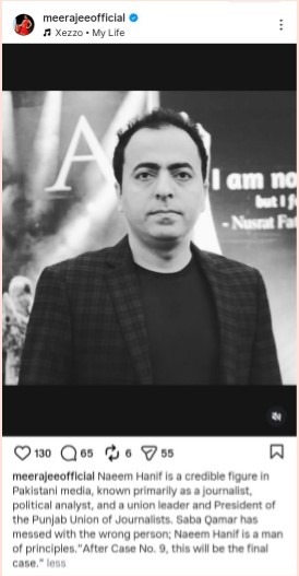 Taking to Instagram, the 48-year-old actress defended Hanif, calling him a “credible figure” and warning Saba not to cross him. Meera wrote, “Naeem Hanif is a credible figure in Pakistani media, known primarily as a journalist, political analyst, and a union leader and President of the Punjab Union of Journalists. Saba Qamar has messed with the wrong person; Naeem Hanif is a man of principles. After Case No. 9, this will be the final case.”