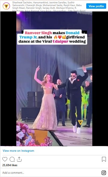Actor Ranveer Singh created a viral moment at a star-studded Udaipur sangeet by inviting Donald Trump Jr. and his girlfriend Bettina Anderson on stage for a spontaneous dance performance.
