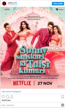 Written and directed by Shashank Khaitan and produced under Dharma Productions and Mentor Disciple Entertainment, Sunny Sanskari Ki Tulsi Kumari features an ensemble cast that includes Maniesh Paul and Akshay Oberoi in supporting roles.