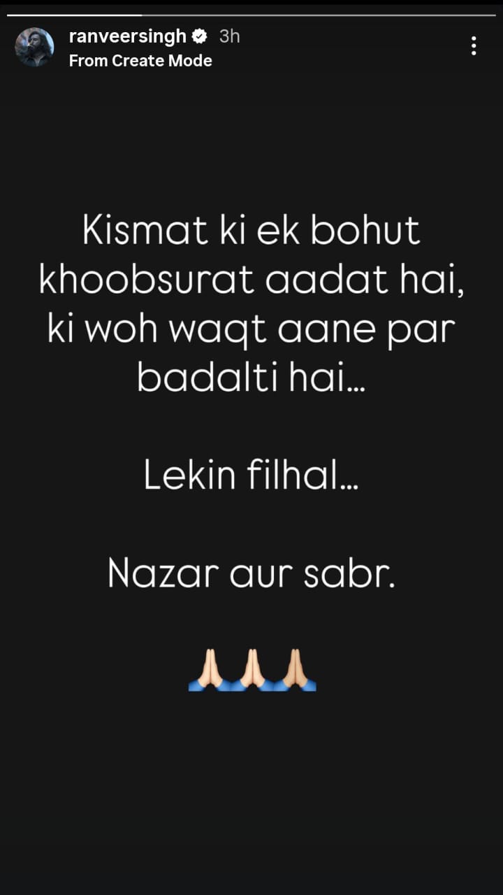 Set against a plain black background, the Hindi quote read, “Kismat ki ek bohot khoobsurat aadat hai, ki woh waqt aane par badalti hai… Lekin filhal… Nazar aur sabr (Destiny has a very beautiful habit of changing when the time is right… but for now… focus and patience).”