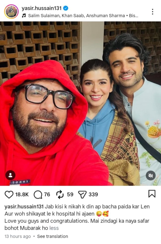 Yasir Hussain uploaded a story on his Instagram yesterday morning that he misses his beloved friend Umer Aalam, that today is his big day and getting married starts a new chapter of his life, and then Yasir Hussain announced the good news that he became a father of a baby girl now, and what happened next is amazing: the newlywed couple Umer Aalam and his wife, Fiza Mansoor, came to the hospital to wish them well on the new member coming into their family, and for this kind gesture of Umer Aalam, Yasir Hussain wrote this in this Instagram post: “Jab kisi k nikah k din ap bacha paida kar Len Aur woh shikayat le k hospital hi ajaen.”