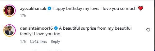 In response Danish reposted his birthday post as well as commented on his wife Ayeza Khan’s birthday post “A beautiful surprise from my beautiful family! I love you too’
