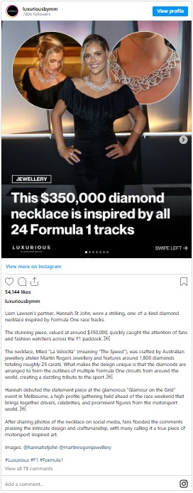 Ahead of the Australian Grand Prix, Hannah attended the annual Glamour on the Grid event, where she wore a one-of-a-kind diamond necklace designed to resemble various Formula 1 race tracks. At first glance, the piece appears as a sparkling cluster of diamonds.