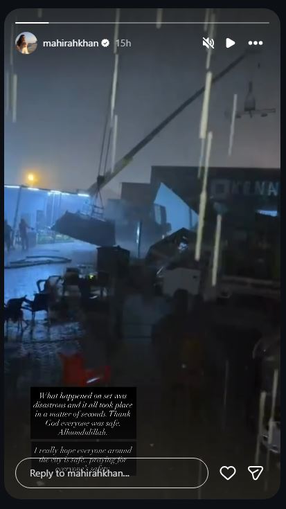 Mahira Khan shared a video of last night heavy rain; she was on the set when the rain started, and the shared clip showing part of the set collapsing and crew members rushing to take shelter.