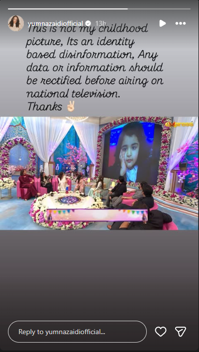 Yumna Zaidi gracefully responded to the whole fiasco by simply correcting the misinformation. After Javeria Saud’s comment spark age shaming debate, She posted a story on her Instagram and write, “this is not my childhood picture, it’s an identity based disinformation, any data and or information should be rectified before airing on national television, Thanks!’