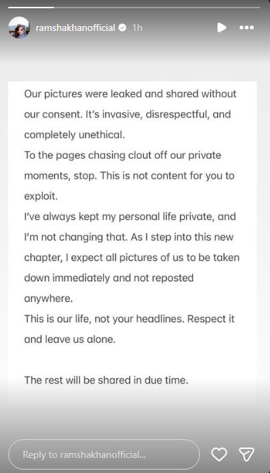 To end this social media buzz, Ramsha Khan has responded to all the rumors, which has created chaos on the internet. She posted a story on her Instagram in which she wrote: