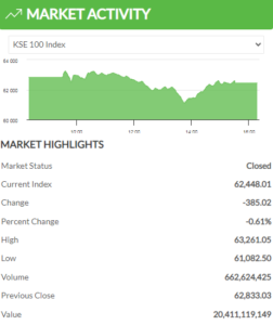 The Pakistan Stock Exchange (PSX) benchmark KSE-100 Index on Wednesday continued being bearish falling 385 points. Stock market value reduced by 0.61% concluding at 62,448 points.