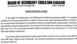 On the orders of the Minister for Education Boards and Universities, the Matriculation Board Karachi exams have been postponed and now the exams will be held from May 28 as per the schedule.