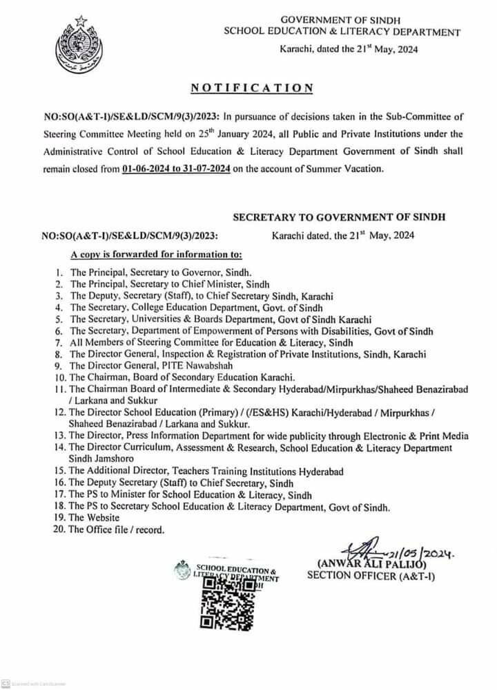 The notification read that the proposal to announce summer vacations in advance on the pattern of Punjab had been under consideration.