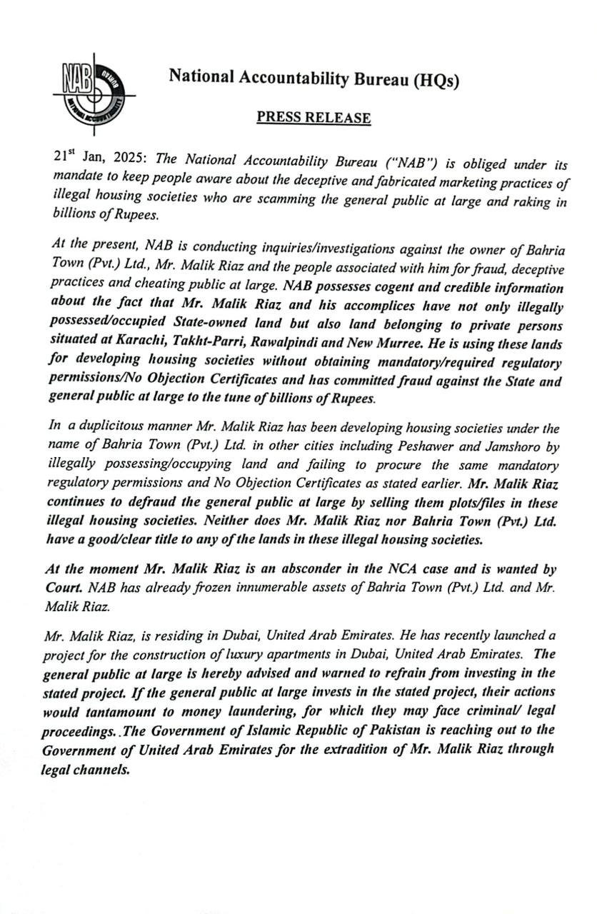 The bureau cautioned that such investments could result in money laundering charges, leading to criminal or legal proceedings. NAB’s statement comes as the government pursues the extradition of property tycoon Malik Riaz from the United Arab Emirates (UAE) through legal channels.