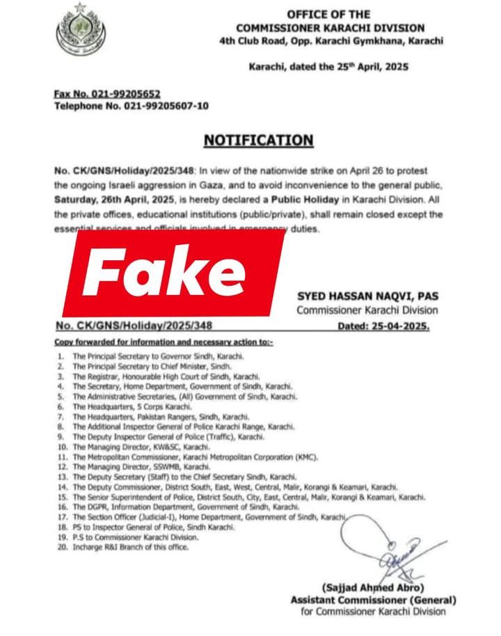 A fake notification claiming a public holiday in Karachi on Friday, April 26, 2024, has gone viral on social media.