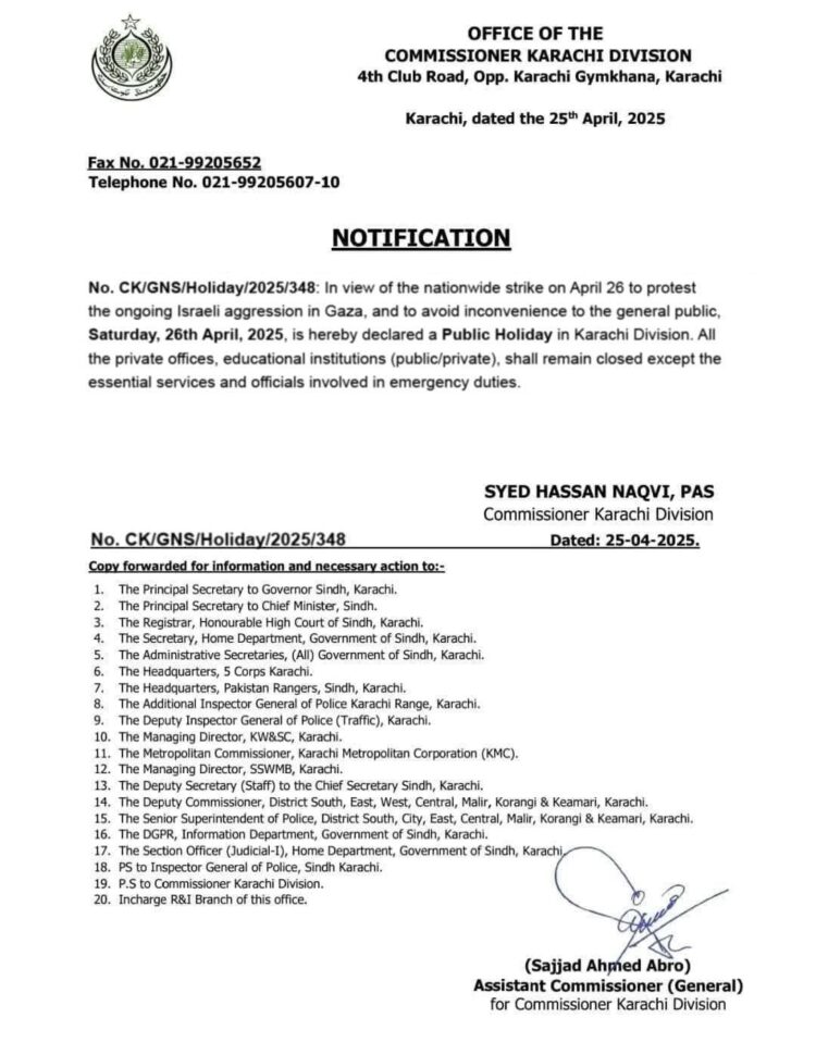 The Commissioner of Karachi has declared Saturday, April 26, 2025, as a public holiday in the city.