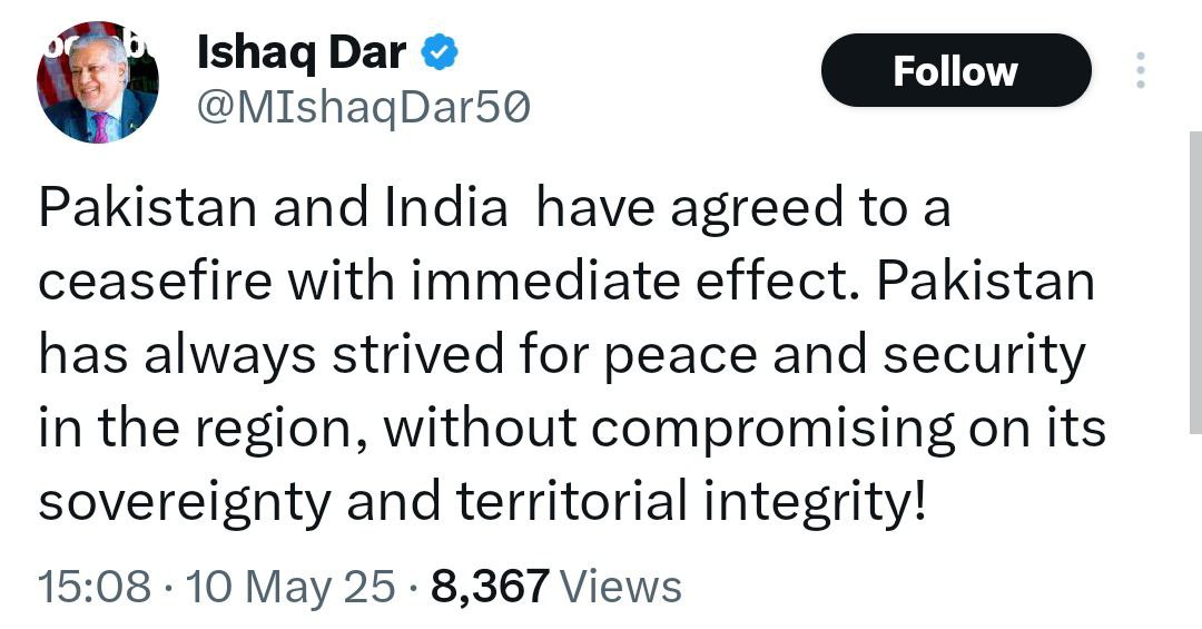 Ishaq Dar made the announcement on social media platform X (formerly Twitter). He said, “Pakistan and India have agreed to an immediate ceasefire. We hope this will pave the way for broader diplomatic engagement and regional stability.”