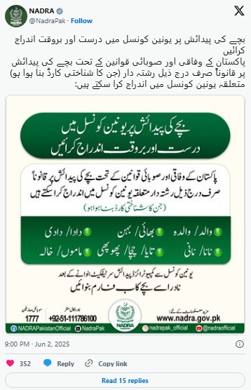 The National Database and Registration Authority (NADRA) has issued an important public message, urging families to register the births of their children on time at their respective Union Councils.