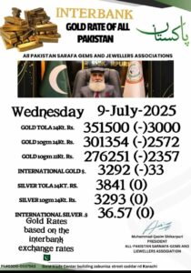 According to the All-Pakistan Gems and Jewelers Sarafa Association (APGJSA), the price of 24-karat gold per tola fell by Rs3,000, settling at Rs351,500. Similarly, the price of 10 grams dropped by Rs2,572, reaching Rs301,354.
