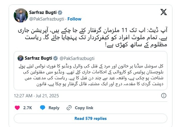 Chief Minister of Balochistan, Sarfraz Bugti, stated in an official statement that 11 suspects involved in the brutal killing of a woman and a man have been arrested.