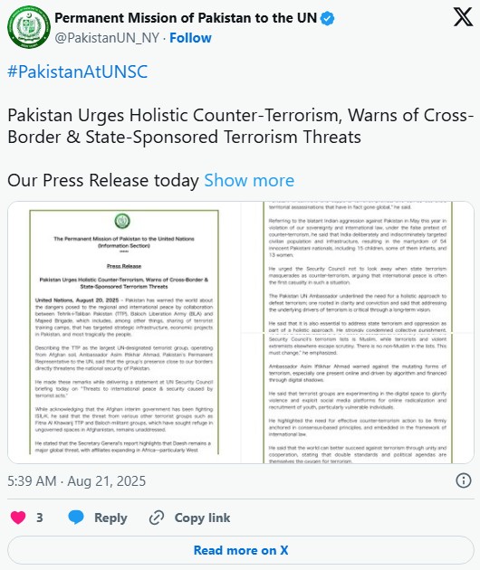 The ambassador also pointed to “credible evidence of collaboration between the TTP and BLA and the Majeed Brigade,” targeting Pakistan’s infrastructure, economic projects, and citizens.