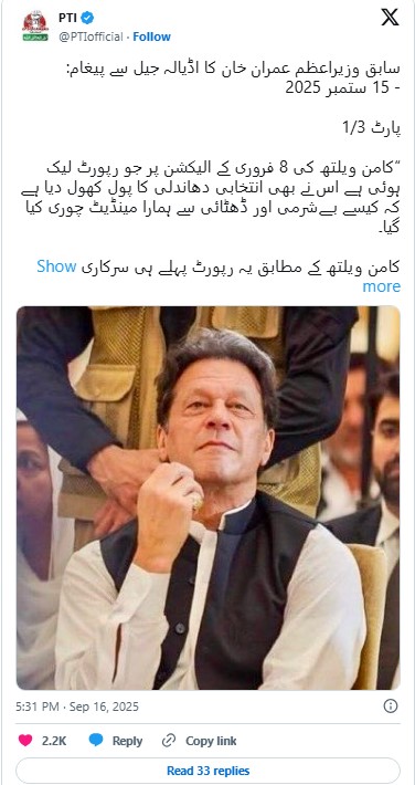It is worth noting that in a 2024 interview, former PTI spokesperson Raoof Hasan had revealed that Khan’s official X account was being operated from abroad, with the party’s social media head based in the United States.