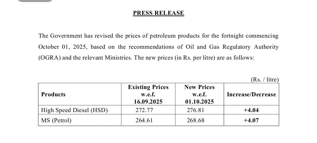 Similarly, the price of high-speed diesel has increased by Rs. 4.04 per liter, with the updated rate now set at Rs. 276.81 per liter.