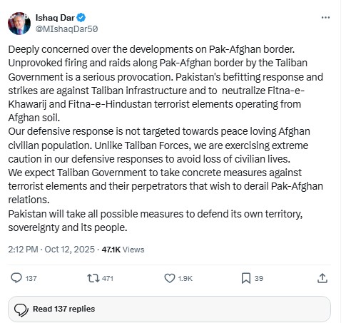 Deputy Prime Minister and Foreign Minister Senator Mohammad Ishaq Dar on Sunday voiced strong concerns over the escalating situation along the Pakistan-Afghanistan border, condemning the unprovoked firing and cross-border raids by the Taliban government. He termed these actions “a serious provocation.”