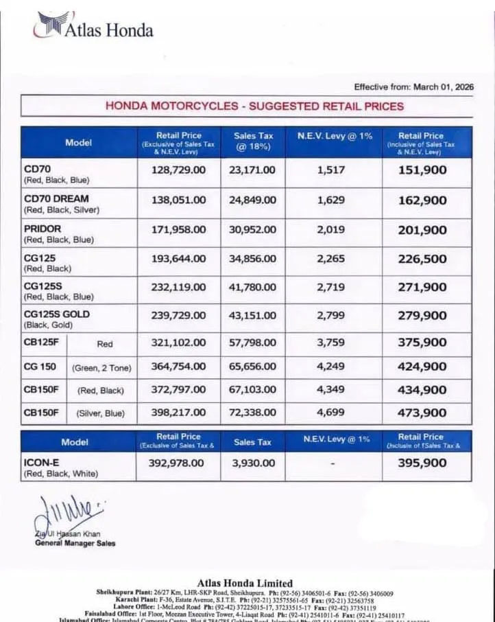 According to the announcement, Atlas Honda has officially cut prices for popular models including the CD 70 and CG 125, among others. The company has issued an official notification confirming that the price reduction will be applied from March 1, 2026.