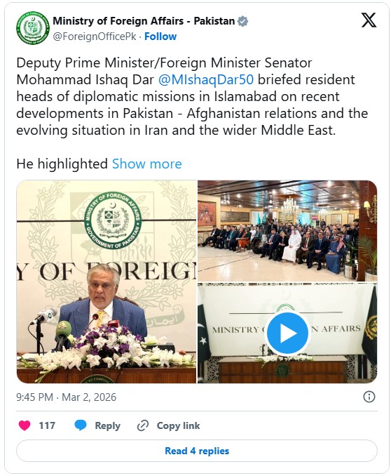 Addressing members of the diplomatic corps in Islamabad, Dar stated that Pakistan is actively engaged in efforts to ease tensions and prevent further escalation. “We are passing through difficult times in terms of diplomacy. All our efforts are focused on reducing tensions and bringing the parties back to the negotiations,” he said.