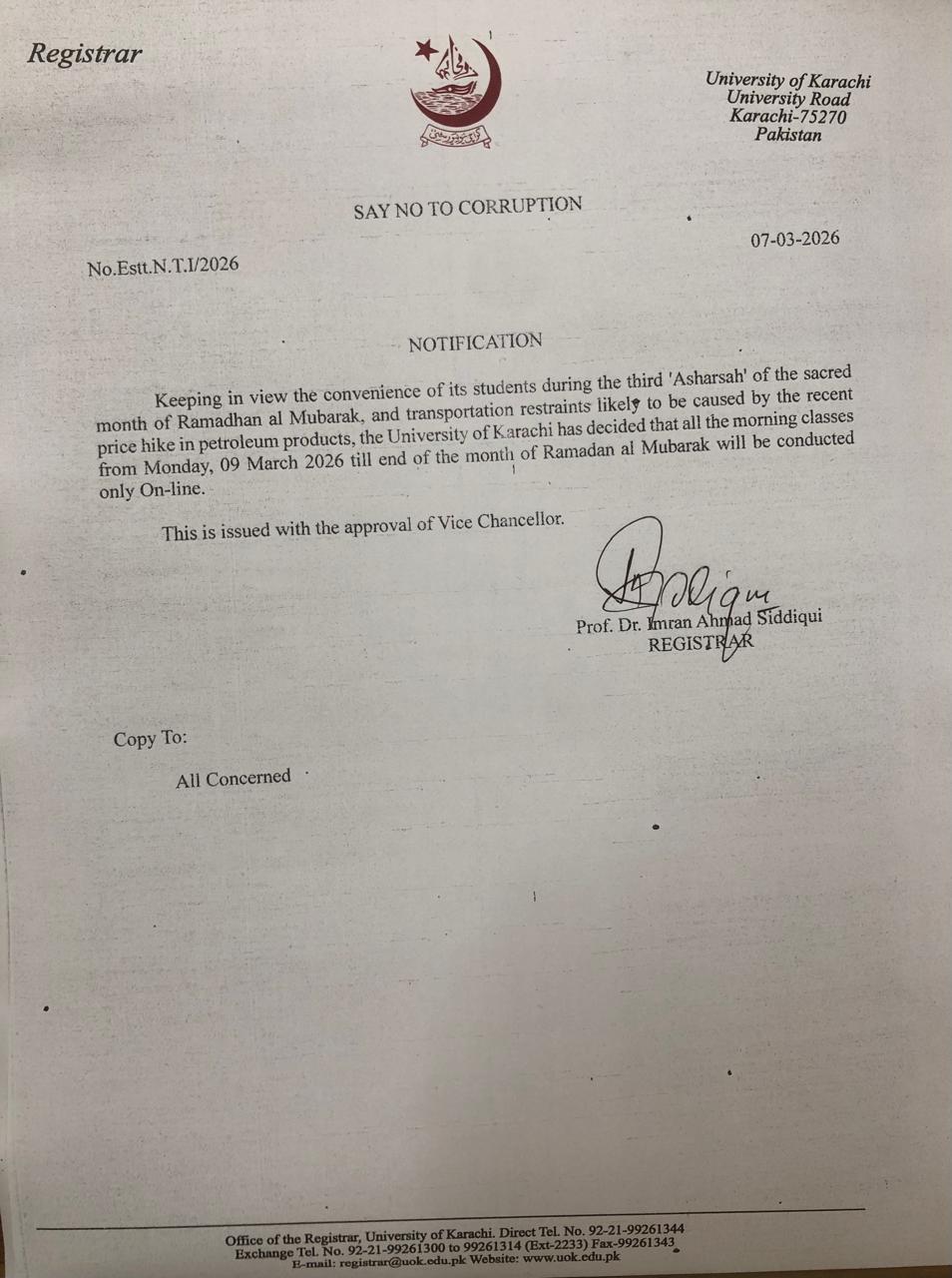 According to the notice, “Keeping in view the convenience of its students during the third ‘Asharsh’ of the sacred month of Ramadhan al Mubarak, and transportation restraints likely to be caused by the recent price hike in petroleum products, The University of Karachi has decided that all the morning classes from Monday, 09 March 2026 till end of the month of Ramadan al Mubarak will be conducted only On-line.”
