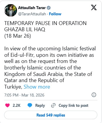 The government of Pakistan has declared a temporary pause in Operation Ghazab Lil Haq, its ongoing counterterrorism campaign in Afghanistan, ahead of the Islamic festival of Eid ul Fitr, according to media reports.