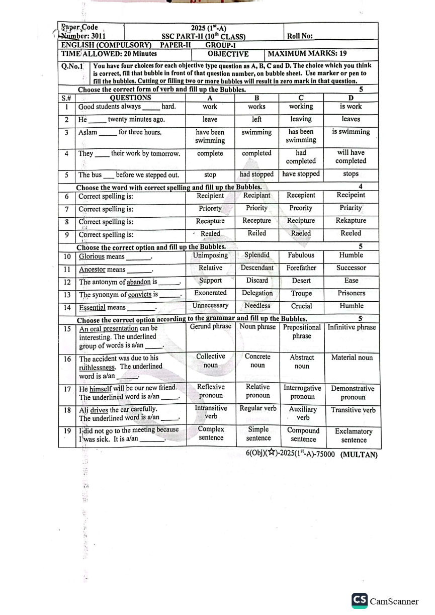The objective section of the English paper will include 19 questions, carrying a total of 19 marks, and students will be given 20 minutes to complete this portion.
