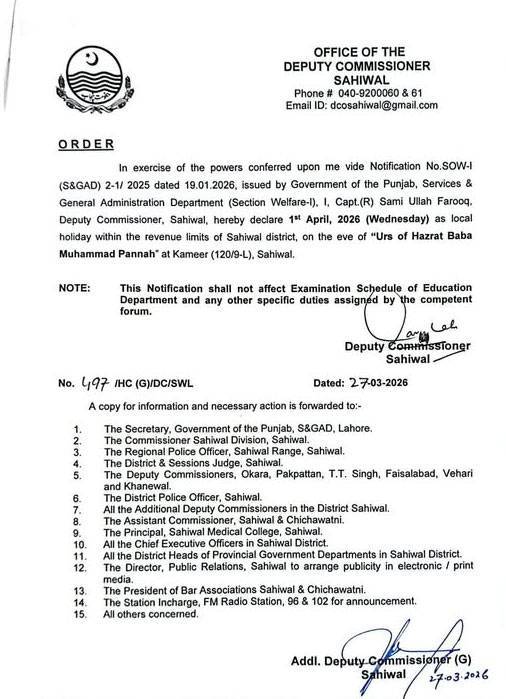 “The Deputy Commissioner, Captain (R) Samiullah Farooq, has announced a local holiday in Sahiwal on April 1 for the Urs of Hazrat Baba Muhammad Panah (RA).”