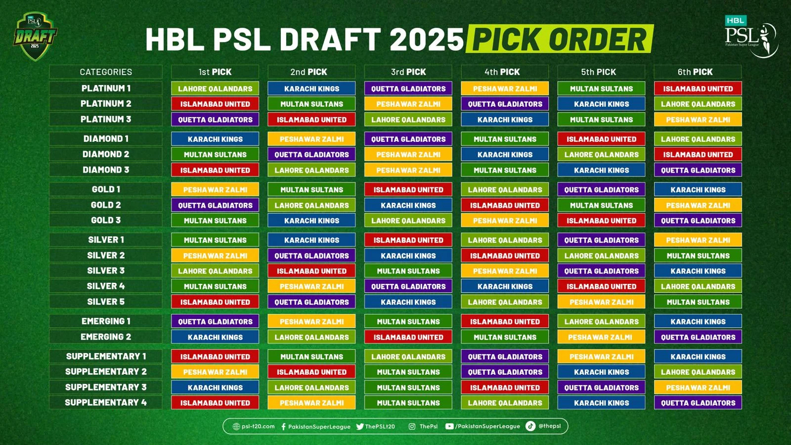 The second round of the Platinum category will follow the reverse sequence, with United making the first pick, followed by Sultans, Zalmi, Gladiators, Kings and Qalandars.