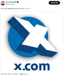 Taking to X, Musk wrote: “All core systems are now on X.com.” He also posted an image of a logo of a white X on a blue circle.