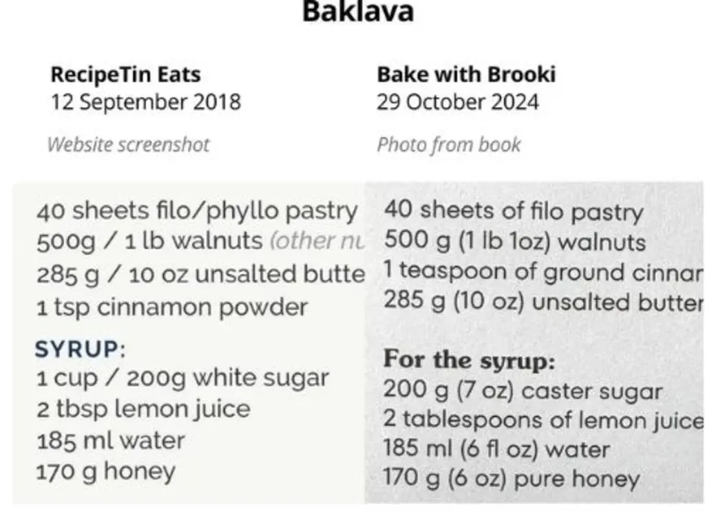 A comparison of Maehashi’s baklava recipe with the one featured in Bellamy’s book. Instagram/recipe_tin