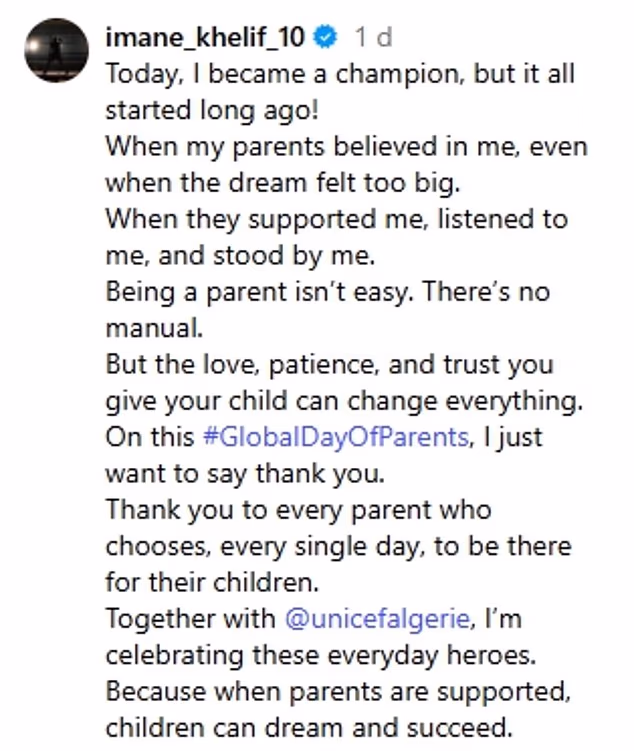 Khelif, 25, who made history by winning gold for Algeria in women’s boxing at the Paris Olympics, ignored the medical leak in her latest social media post. Instead, she posted a message of gratitude on Instagram for UNICEF’s Global Day of Parents, calling mothers and fathers “everyday heroes”.