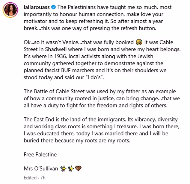 Laila also spoke about her roots in East London. She mentioned Cable Street, where she was born, and the historical Battle of Cable Street in 1936, where local communities stood against fascism. Laila said she feels deeply connected to this area and plans to be buried there one day. She ended her post with “Free Palestine” and signed off as “Mrs O’Sullivan.”