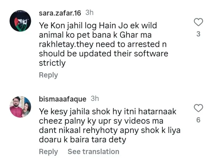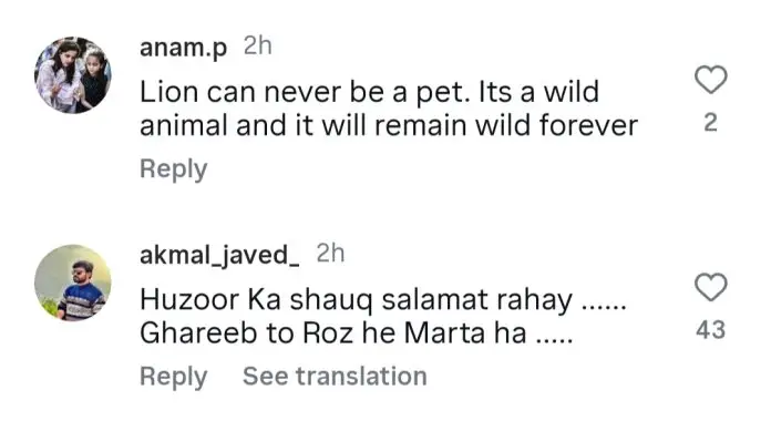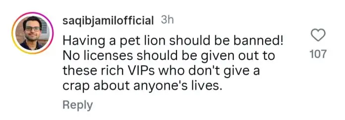 One user commented, “That poor lion should not be kept in captivity. Send the owner to jail.” Another questioned, “Why is the government giving licenses to these people?” A third wrote, “These jahil people keep wild animals in their homes. This is wrong.”