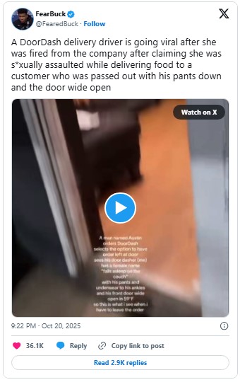 Livie Rose Henderson was terminated from her position two days after reporting an incident where a man allegedly exposed himself during a delivery on October 12, 2025. The DoorDash driver claimed she faced sexual harassment when the man reportedly lowered his pants in her presence while she was delivering an order.