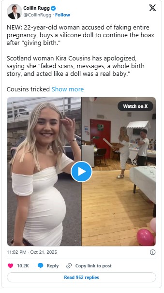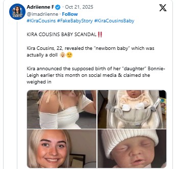 Kira Cousins, a Scotland-based woman, has sparked widespread online attention after apologizing for deceiving her family and friends about being pregnant and having a daughter named Bonnie-Leigh Joyce. In a confession posted on October 21, 2025, Cousins admitted that her entire pregnancy story was fabricated and that she had used a prosthetic baby bump to mislead those close to her. The viral revelation has left many shocked, with Cousins taking full responsibility for the lies she spread.