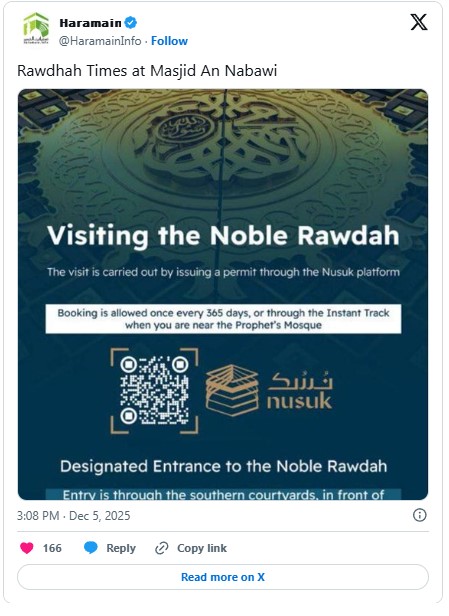 Special arrangements have been made for Fridays, one of the busiest days at the Prophet’s Mosque. As per the revised guidelines, “men can visit from after Jumu’ah prayer until Isha, while women may visit from after Fajr until 9 a.m.”