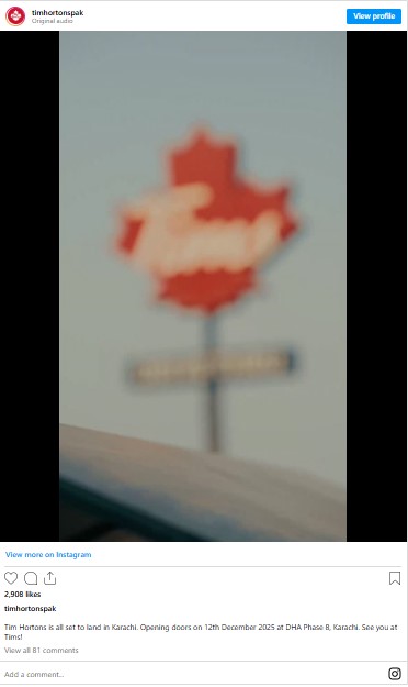 In a social media post, the company stated, “Tim Hortons is ready to make its entry into Karachi. Doors open on December 12 at DHA Phase 8, Karachi. See you at Tim’s!”